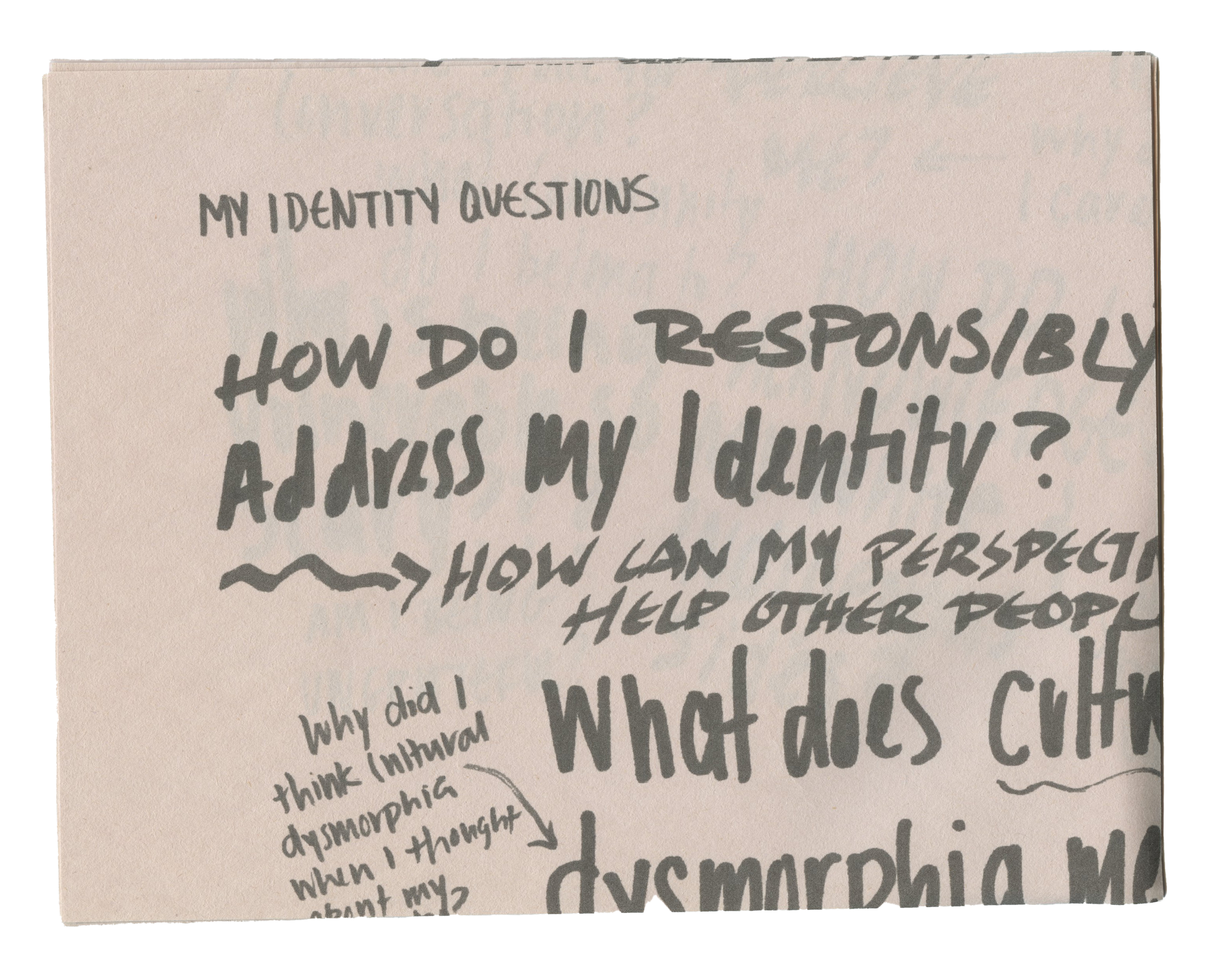 The goal of this project is to start the conversation about how we look at our own identity. These artifacts are a collection of ways I’ve begun to appraoch my personal cultural dysmorphia. They where crafted through an inquiry process in hopes that they would allow others to understand the importance of vulnerability in order to begin collaboratively working to uncover what our identities mean in context of today. Each of our unique perspectives has so much to add to the conversation, so it’s important to begin sharing your lived experience. Please use and share these artifacts in any way you see fit.