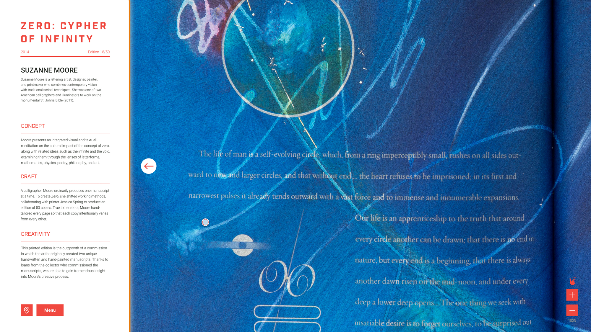 I managed all aspects of the design process, seeking feedback from other design team members to refine our approach. The interactive component allowed visitors to navigate through high-quality images of the books, enhancing their experience with moments of curated information. This content was developed in collaboration with the curator, ensuring that visitors received guided insights into the most interesting and significant aspects of each book.